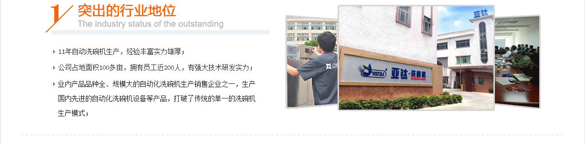 東莞市亞鈦自動化科技有限公司位于珠三角經濟中心地帶的東莞,享譽“世界工廠”之稱,東莞亞鈦自動化科技有限公司是一家致力于商用洗碗機的研發、制造、項目投資運營管理一體化的高新技術企業。本公司率先引進歐盟、日本等多家國際先進技術及專業制作人才,使產品在生產工藝、產品質量、洗滌效果等方面達到較高水平,形成了以物理處理為核心的產業化、集成化餐具清洗、消毒處理、包裝技術,立足成為“商用洗碗機一體化運作名牌企業”。
